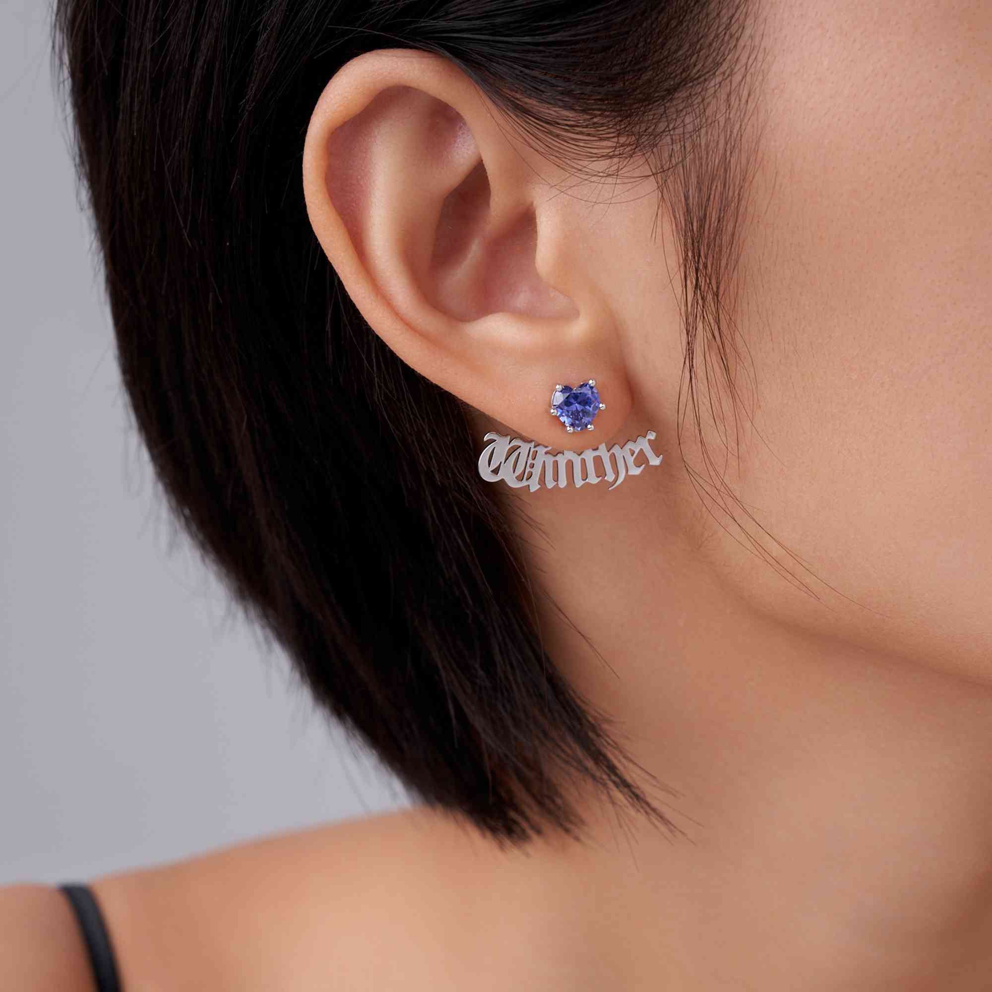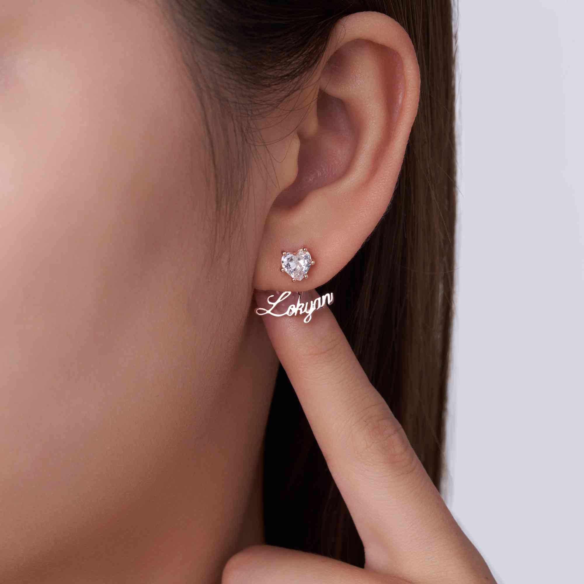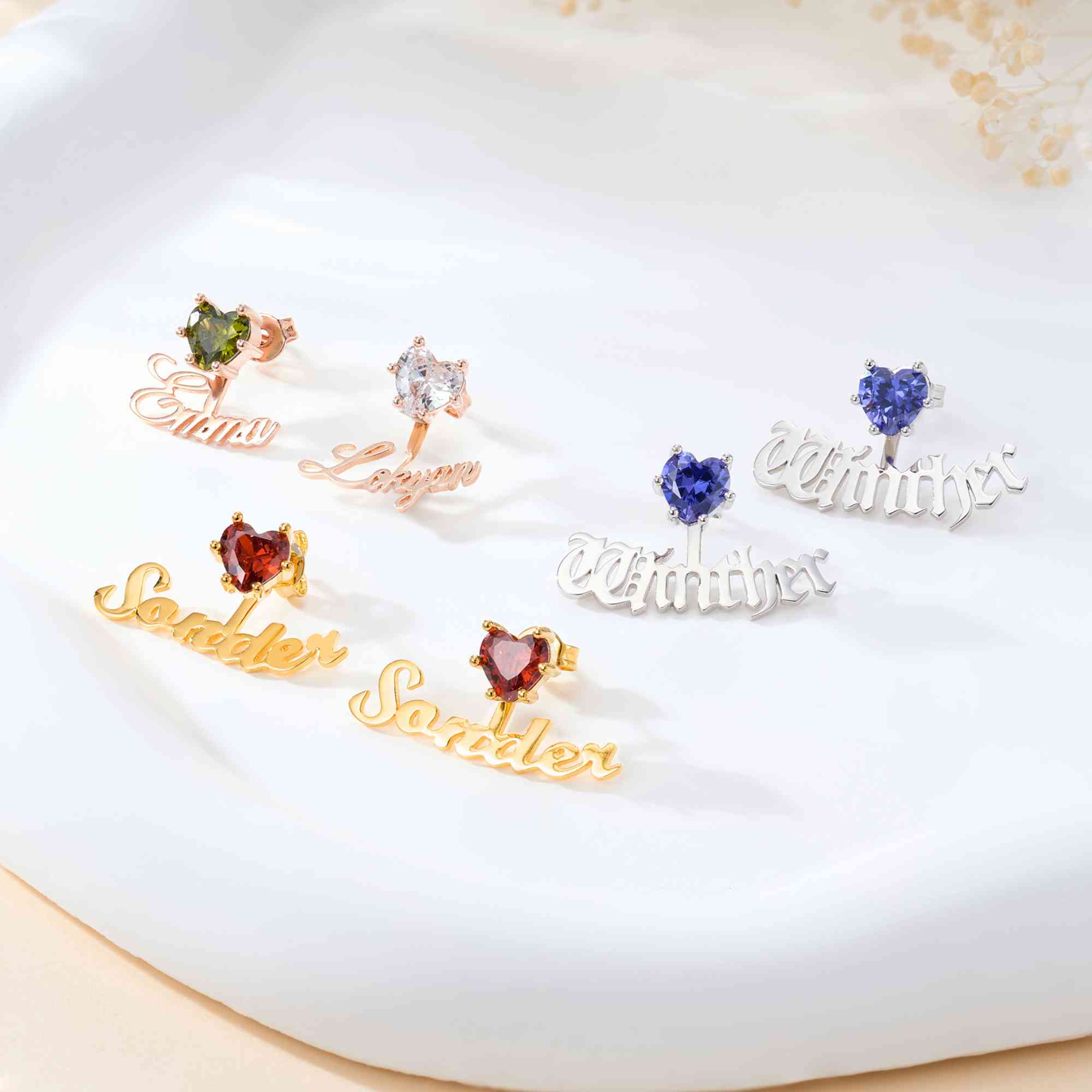 Delicate Heart Style - These custom stud earrings showcase elegant name designs paired with sparkling heart birthstones, representing love, affection, and meaningful bonds in a refined and timeless way.
