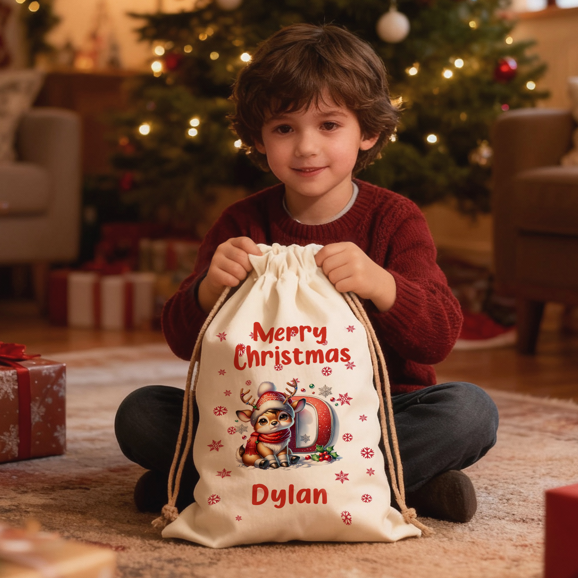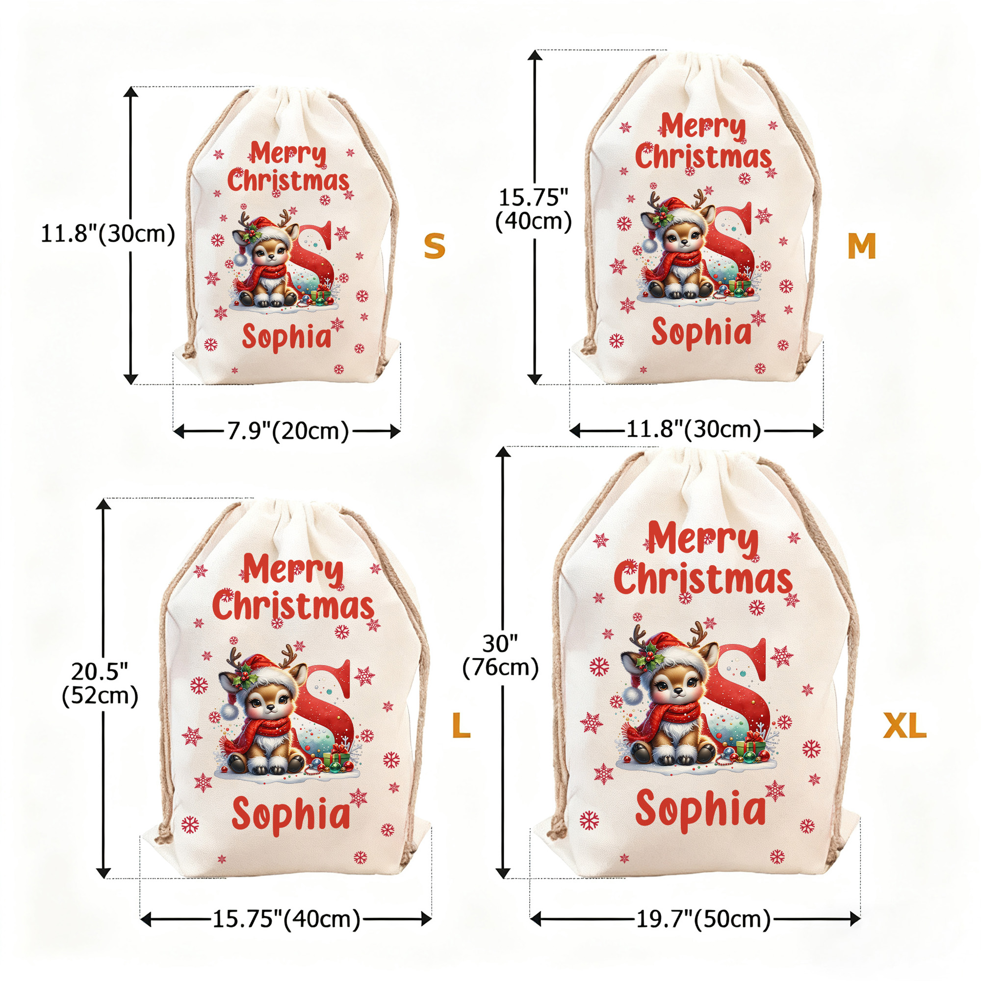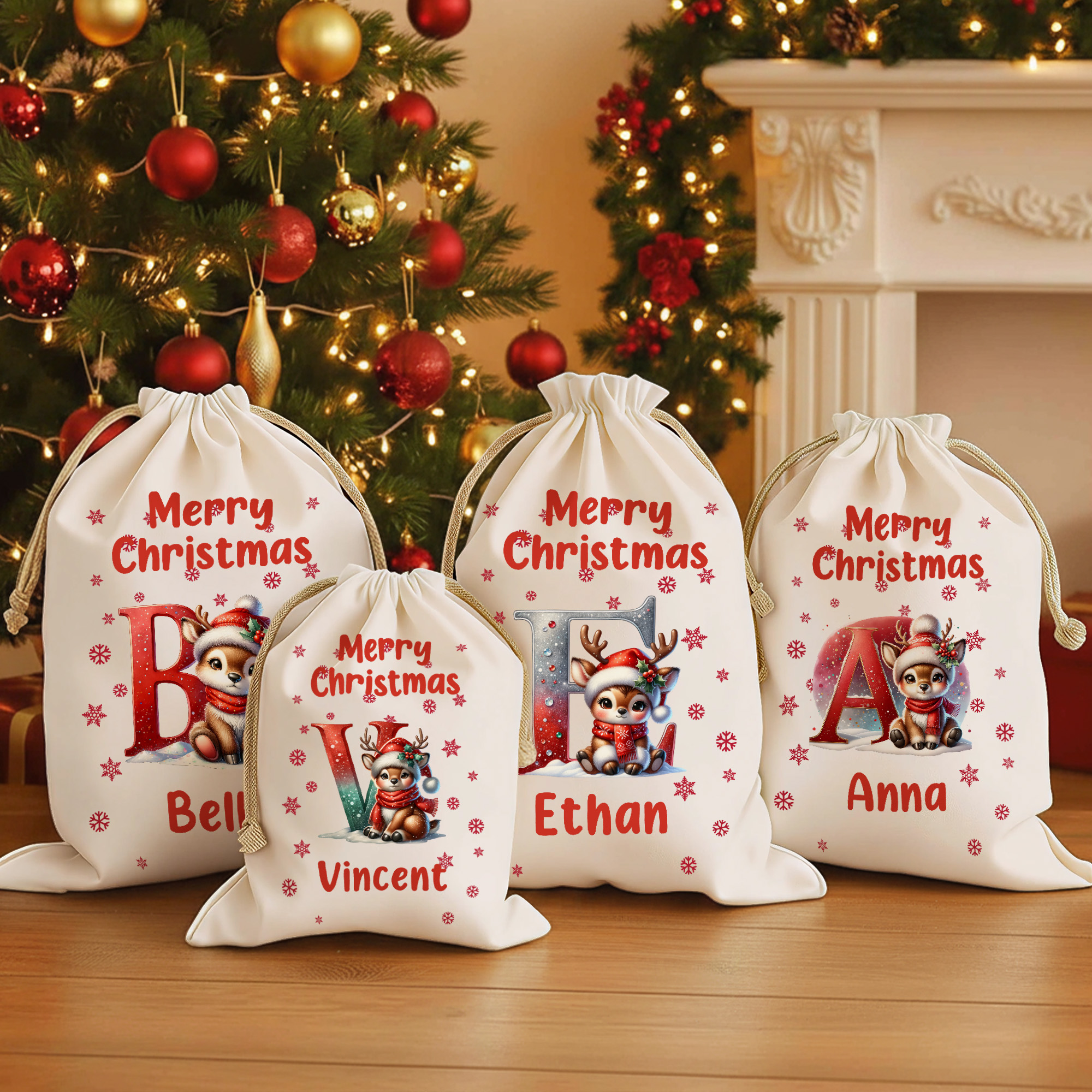 Custom Name - Personalize each sack with a name and matching initial to create a meaningful keepsake. The custom touch adds warmth and helps easily identify gifts under the Christmas tree, making every present feel special.