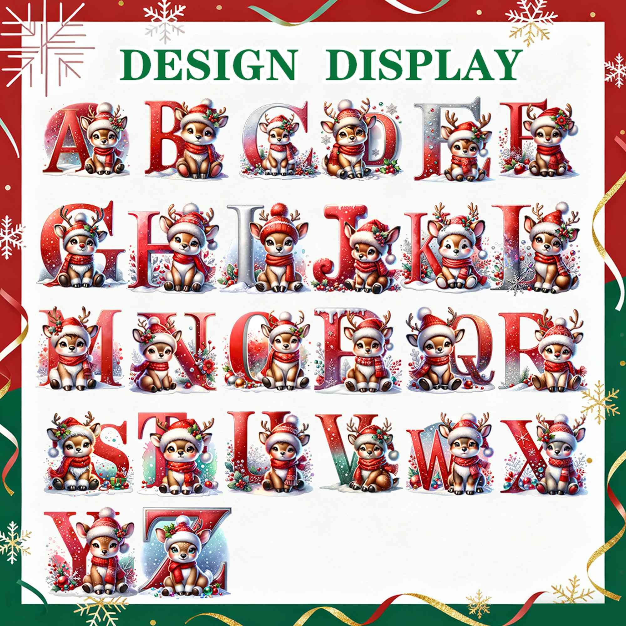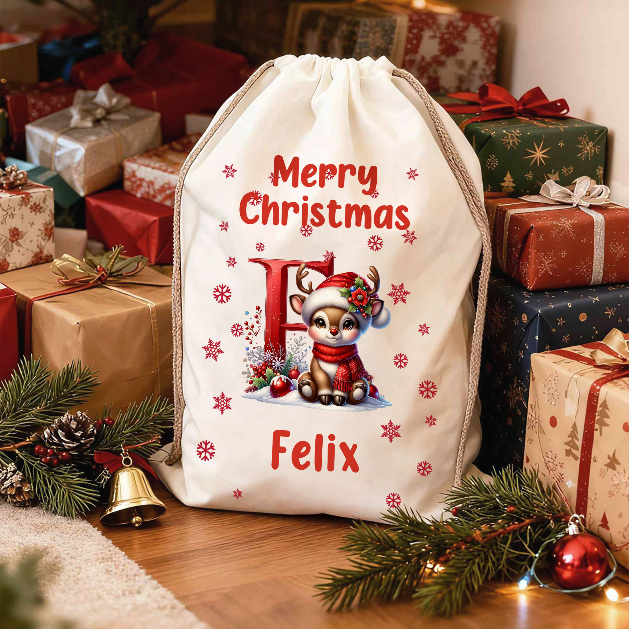 Festive Elk & Alphabet Design - This Christmas gift sack showcases a cute cartoon elk and alphabet design accented with snowflakes and baubles, perfectly reflecting the joyful magic of the season. It brings an extra dose of holiday cheer to kids and families alike.